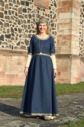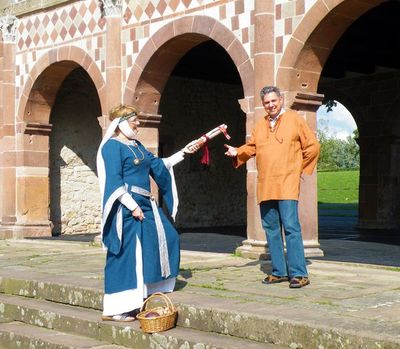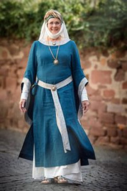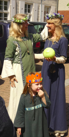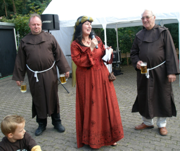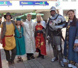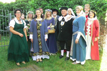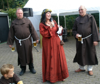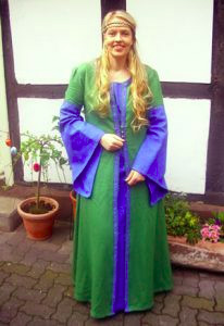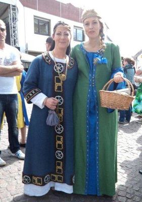 Die Großauheimer Auch-Geschäftsfrau Kerstin Koppke Hain besaß bereits Irminrat-Erfahrung: Stand sie doch schon beim großen Theaterstück anläßlich der Auheimer 1200-Jahr-Feier als Irminrat auf der Bühne. Wir wußten noch nicht, ob unsere Freude an der neuen Figur sich verbreiten würde, so war es einiger Mut notwendig, das Theaterkostüm „anzubehalten“ und sich so den Großauheimern als neue Patronin zu präsentieren, die Kleidung wurde auf blau und grün festgelegt: blau für den Fluß, grün für die Au. Wie gut, dass sie damals so beherzt „JA“ sagte!