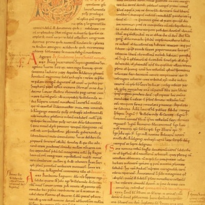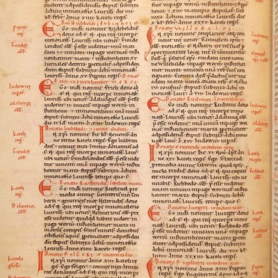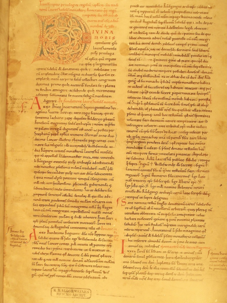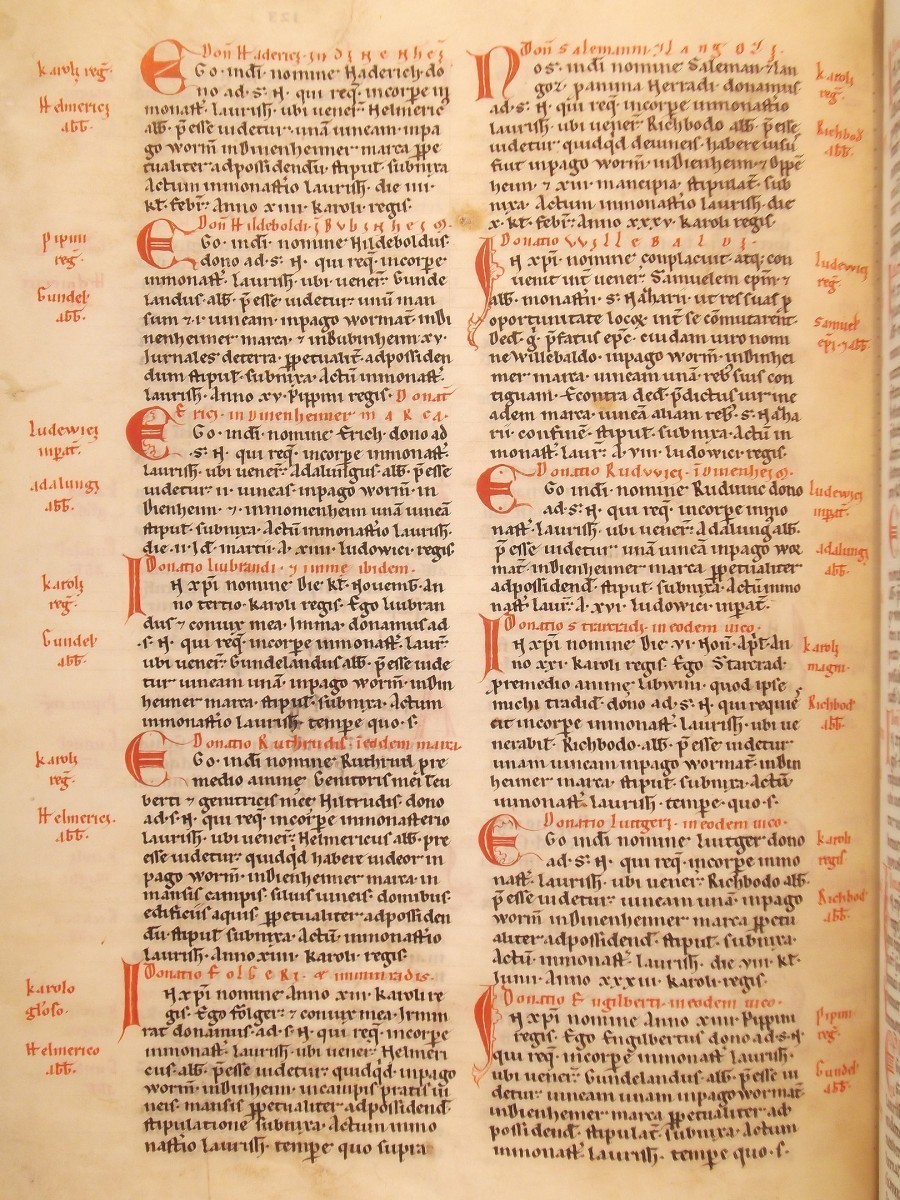 In Christi Namen, am 30. März im 38. Jahre des (Kaiser Karl). Ich, Irminrat, lasse dem hl. Märtyrer Nazarius eine Gabe zukommen. Sein Leib ruht im Lorscher Kloster, dessen Vorsteher der verehrungswürdige Abt Adalungus ist. Nach meinem Willen soll die Schenkung für alle Zeiten in Kraft bleiben, und ich versichere, dass ich sie vollkommen freiwillig gemacht habe. Ich übergebe im Maingau in Rompenheim, in Bellingen und in Ewicheim sechs Hufen und 40 Leibeigene.“